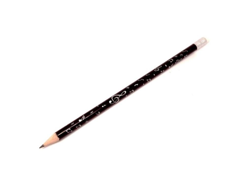 Klasická dřevěná tužka v černé barvě, kterou zdobí stříbrný motiv hudebních symbolů (houslové klíče, basové klíč, noty i pomlky). Tužka je doplněna gumou a plíškem v stříbrné barvě. Rozhodně by neměla chybět v penálu žádného hudebníka. Pro větší pohodlí pro Vás jsou z výroby již ořezané.