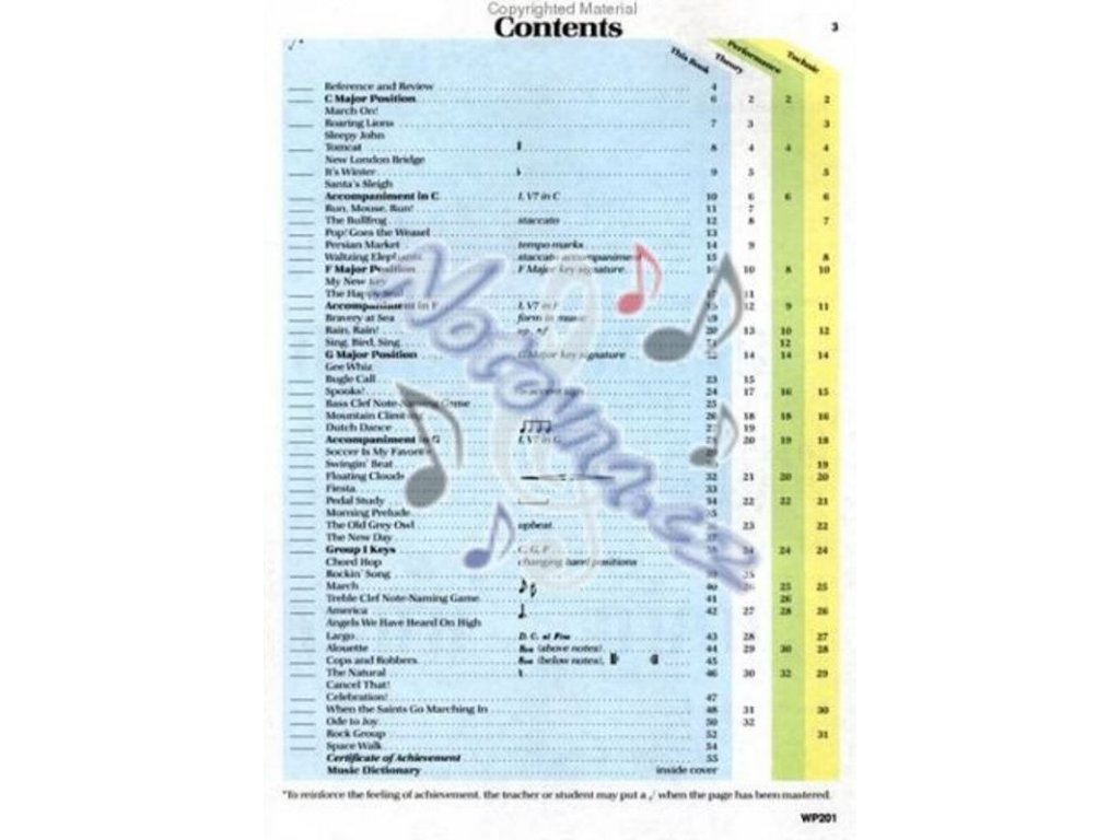 Každá obtížnost obsahuje čtyři samostatné sešity - PIANO (hlavní sešit), THEORY (teorie), TECHNIC (technika) a PERFORMACE (přednesové skladbičky na vystoupení).