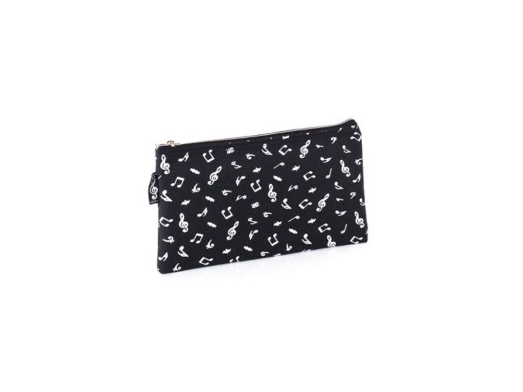 Elegantní textilní taštička určena primárně jako penál na psací potřeby. Zdobena bílými hudebními symboly. Zapínání na zip s kovovým jezdcem ve tvaru houslového klíče. Velikost 20x10cm.