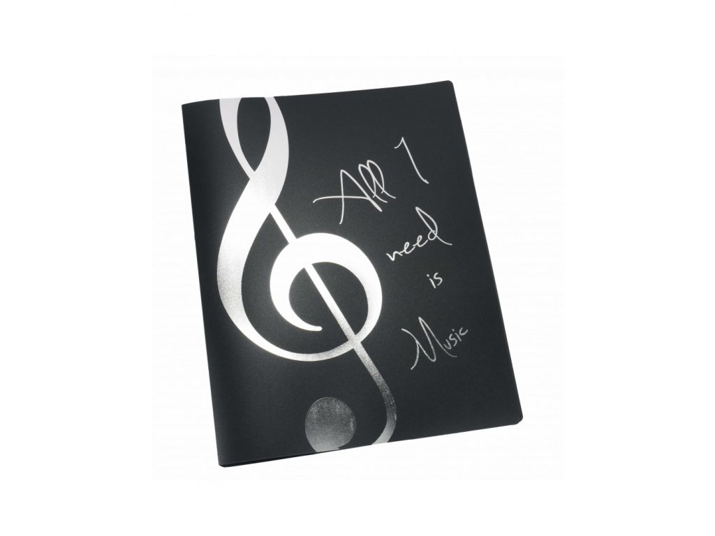 Uvnitř desek s houslovým klíčem a nápisem 'All I Need Is Music'' se ukrývá 20 průhledných fólií ve formátu A4, určené na noty či další dokumenty.