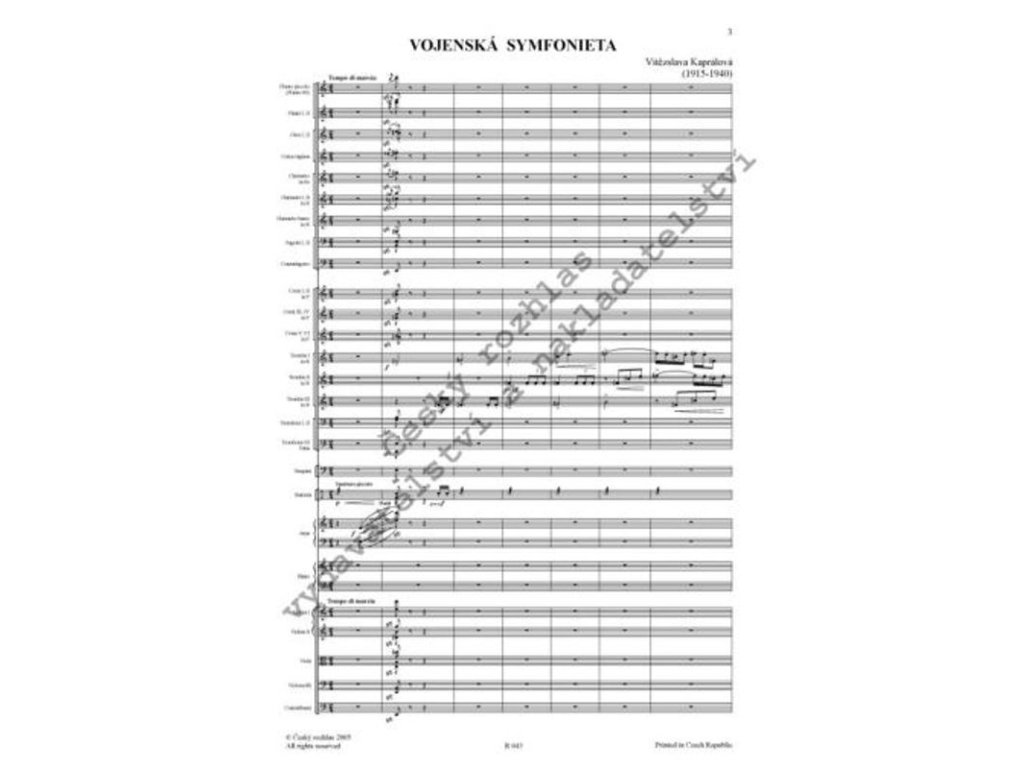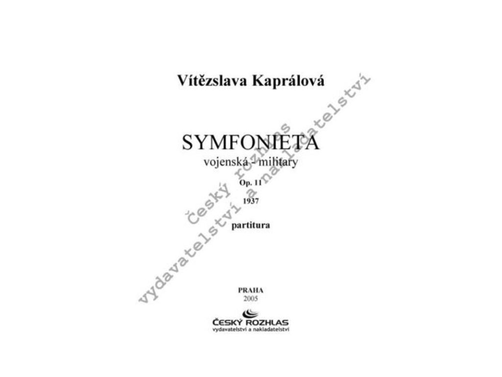 Skladbu, kterou Kaprálová věnovala prezidentu republiky Edvardu Benešovi, poprvé provedla Česká filharmonie pod vedením autorky na koncertu Ženské národní rady v pražské Lucerně dne 26. listopadu 1937. V následujícím roce, dne 17. června 1938, Kaprálová tímto dílem zahájila festival Mezinárodní společnosti pro soudobou hudbu v Londýně, kde dirigovala orchestr BBC. Skladbu vydal Melantrich v listopadu 1938 v Praze pod názvem Symfonieta (vojenská-militaire-military) a o dvacet let později Hudební fond (ve faksimilové verzi) pod názvem Sinfonietta militare. Nyní se vám tedy do rukou dostává její třetí vydání.