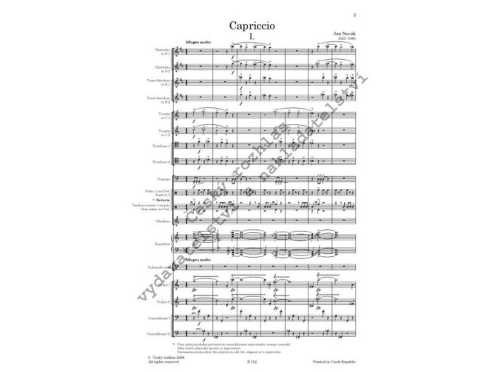 Capriccio patří k ranému kompozičnímu období Jana Nováka. Je to dílo o třech větách plné hravosti a svěžesti, prozrazující zájem o veškeré kompoziční techniky své doby včetně jazzových prvků; zůstává ale dílem naprosto osobitým a originálním. Rytmicky kypí životem, synkopovanou a tečkovanou rytmizací, vyniká brilantní instrumentací, která inspiruje k neobvyklým technickým provedením, např. v klavíru: "pěstmi" nebo v celle "sul ponticello", při kterém nikdy nedospívá k agresivnímu tónu, nýbrž zvyšuje dojem exuberance mládí. Stránce zvukové dominuje kvarta, triton, septima, a nona, jakož i hravost motivické práce, která zvyšuje živelný dojem kompozice.