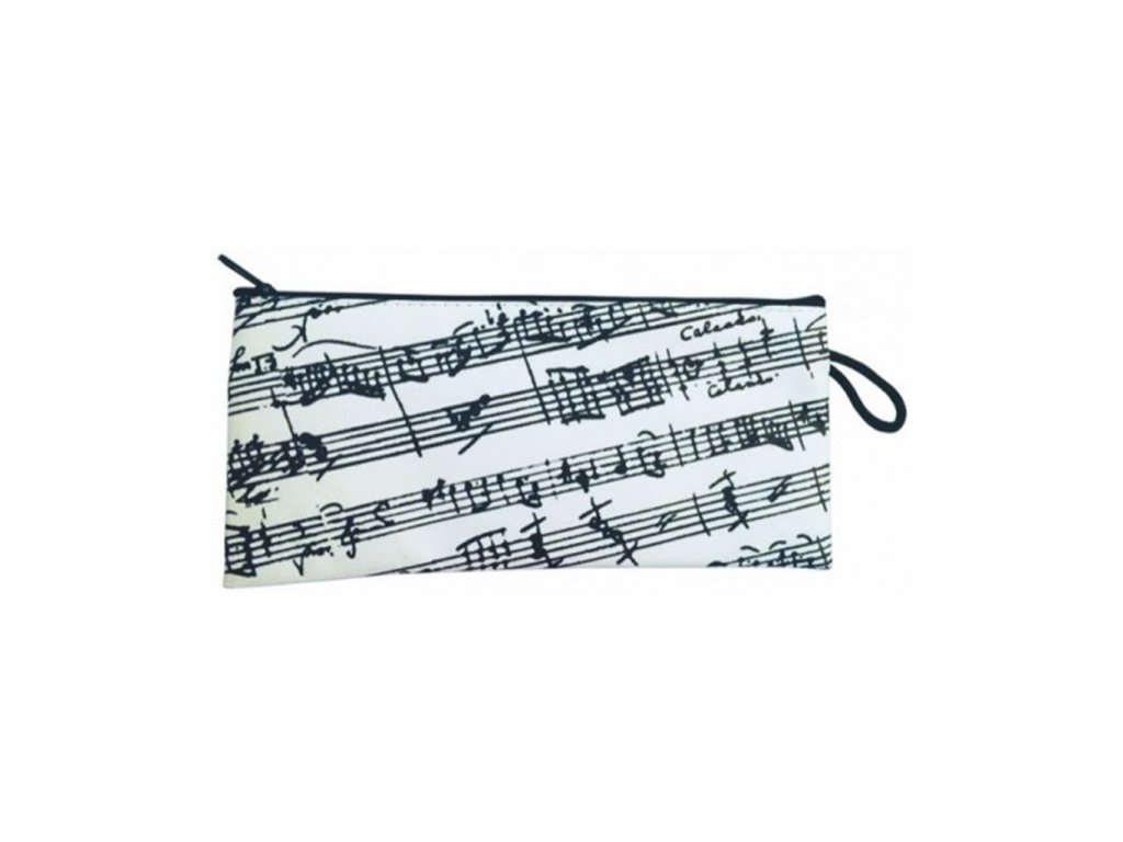 Elegantní textilní taštička určena primárně jako penál na psací potřeby. Zdobena bílými hudebními symboly. Zapínání na zip s kovovým jezdcem a poutkem pro zavěšení. Velikost 20x10cm.Doplňkové parametry