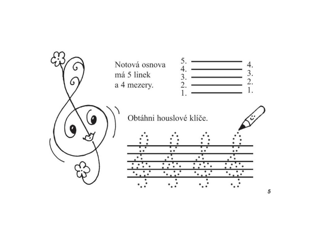 Pracovní sešit je určen pro I. stupeň základních škol a přípravného ročníku základních uměleckých škol. Děti se hravou formou seznamují se základními hudebními pojmy v podobě říkadel, písniček a úkolů, které doplňují. Sešit obsahuje snadná cvičení na psaní not a pomlk. Písničky a říkadla navazují na probrané hudební pojmy. Sešit je doplněn obrázky s hudebními náměty známého ilustrátora Miloše Nesvadby.