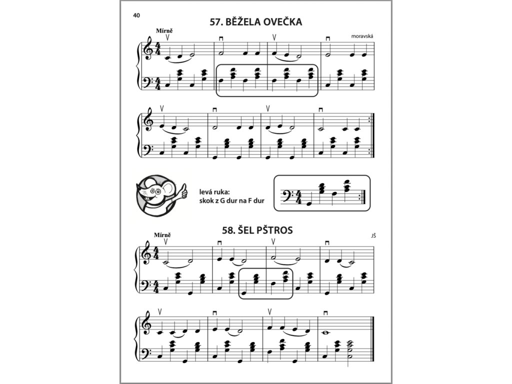 Písničky jsou zpočátku doprovázeny v levé ruce základními basy C, G a F, ale brzy se přidávají také akordy C dur, G dur a F dur. Některé skladby se v publikaci objevují vícekrát – vždy s novým prvkem, který žák postupně zvládá a přirozeně si upevňuje.