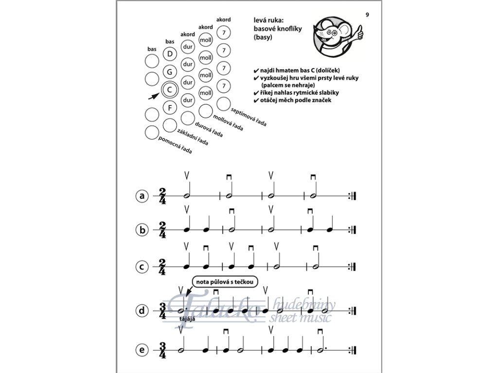 rvní díl nové řady Akordeonová školička přináší přehledný a postupný úvod do hry na akordeon. Publikace kombinuje krátká technická cvičení s bohatým výběrem písniček, aby si začátečník osvojoval nové dovednosti přirozeně a hravou formou.