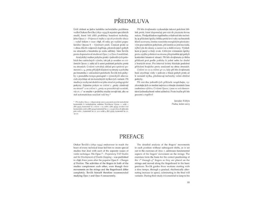 Naše nové vydání Opusu 7 vychází ze zmíněného prvního tisku, ale pracuje i s dalšími prameny ze Ševčíkovy pozůstalosti. Vydání editorsky připravil a předmluvu napsal Jaroslav Foltýn, významný houslový pedagog a dlouholetý profesor Pražské konzervatoře.
