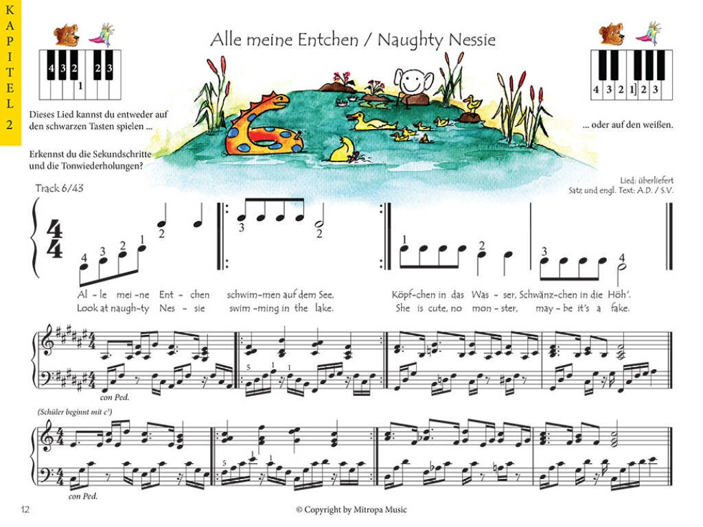 „Sing- und Spielheft 1“ (zpívej a hraj) je doplňující sešit k této škole a je určený pro nejmenší klavíristy. Publikace vychází z výukové metody - poslouchej, zpívej, hraj a zapisuj, a propojuje tak výuku notové gramotnosti se schopností hrát podle sluchu podle textu písní. Repertoár zahrnuje řadu tradičních, známých i nově komponovaných písní a motivů, které jsou jednoduché, rytmicky i melodicky srozumitelné pro děti předškolního a mladšího školního věku, a jsou koncipovány tak, aby učitel mohl snadno přecházet od poslechu a zpěvu k vlastnímu hraní.