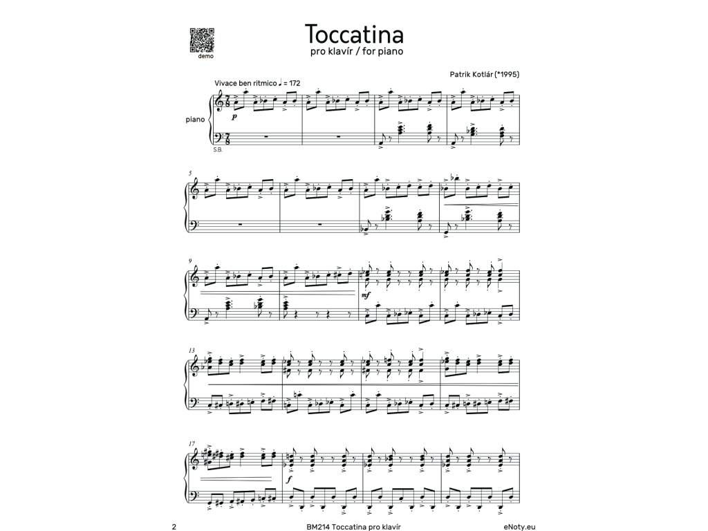 „Toccatina“ je rychlá a efektní přednesová skladba v 7/8 rytmu, kterou skladatel Patrik Kotlár napsal pro mírně a více pokročilé klavíristy.