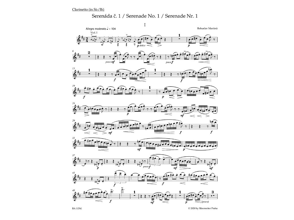 V komorní hudbě Bohuslava Martinů nebyla nestandardní nástrojová obsazení výjimkou, zvláště v jeho pařížské tvorbě 20.–30. let, které se vyznačovalo experimentováním se zvukem i formou. V této době zkomponoval také cyklus čtyř „malých serenád“, z nichž Serenáda č. 1 vznikla v roce 1932. Po neúspěšném jednání s nakladatelstvím Schott nakonec serenády vyšly v pražském Melantrichu, ale až v roce 1949. Dva roky předtím měly 16. října premiéru v Praze v podání hráčů orchestru FOK.Přestože studijní partitura Serenády č. 1 byla poprvé vydána tiskem ještě za skladatelova života, Martinů se na její přípravě nepodílel, bez jeho účasti vyšel v roce 1954 také provozovací materiál. Jako hlavní pramen předkládané edice byla proto zvolena autografní partitura.