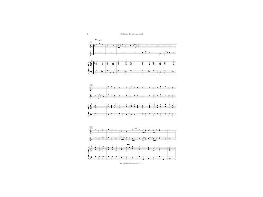 Nástrojové obsazení: oboe (flauto), violino, basso continuo. Largo, Allegro, Adagio, VivaceUkázka: