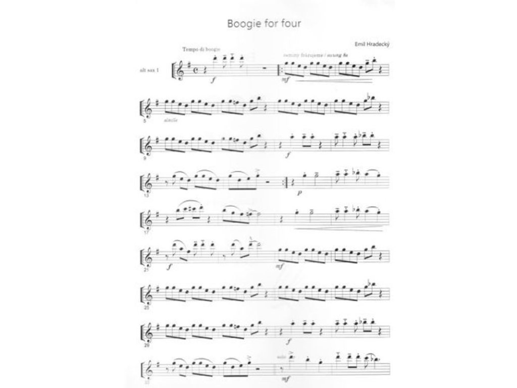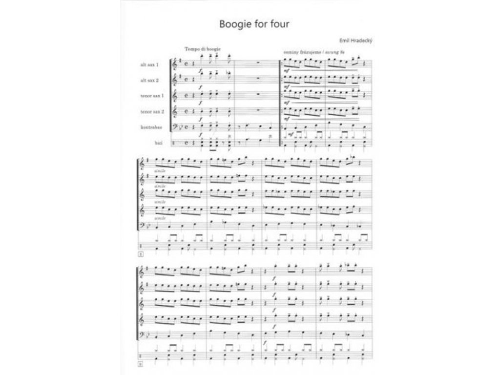 Tento titul Vám nabízí skladbu Boogie for four (Boogie pro čtyři) v úpravě pro čtyři saxofony (AATT), kontrabas nebo basovou kytaru a bicí. Sešit obsahuje partituru plus samostatně vložené party pro jednotlivé nástroje.Titul je vydán také v úpravě pro čtyři klarinety (kod: BM091) a oba tituly lze vzájemně kombinovat. Můžete si tak zahrát toto povedené boogie v jakékoliv kombinaci klarinetů a saxofonů.