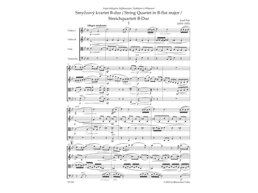 Životní dráhu Josefa Suka (1874-1935), renomovaného skladatele a aktivního houslisty v jedné osobě, formovalo členství v Českém kvartetu založeném r. 1892. Suk zde působil do r. 1933 a vystoupil na téměř čtyřech tisících koncertů. Skladby pro smyčcové kvarteto mají proto v Sukově tvorbě přirozeně své zastoupení. Smyčcový kvartet č. 1 B dur op. 11 (1896) byl zároveň jeho první skladbou vydanou nakladatelstvím Simrock. Tento mistrovský kus mladého umělce považoval jeho tchán Antonín Dvořák za to nejlepší, co od něho zná . Skladatel k němu dvacet let po jeho dokončení zkomponoval novou čtvrtou větu, neboť s jejím původním zněním byl nespokojen. Nová verze se ale přes shodný tematický materiál stylově značně liší, a tak se hravá spíše samostatně. Hlavním pramenem pro kvartet v původním tvaru bylo pozměněné druhé vydání Simrockovo, pro alternativní finále partitura a opisy hlasů se Sukovými korekturami. - předmluva (tsch./engl./dt.) a vydavatelská zpráva (engl.) od editora - obsahuje také pozdější přepracování čtvrté věty (1915)
