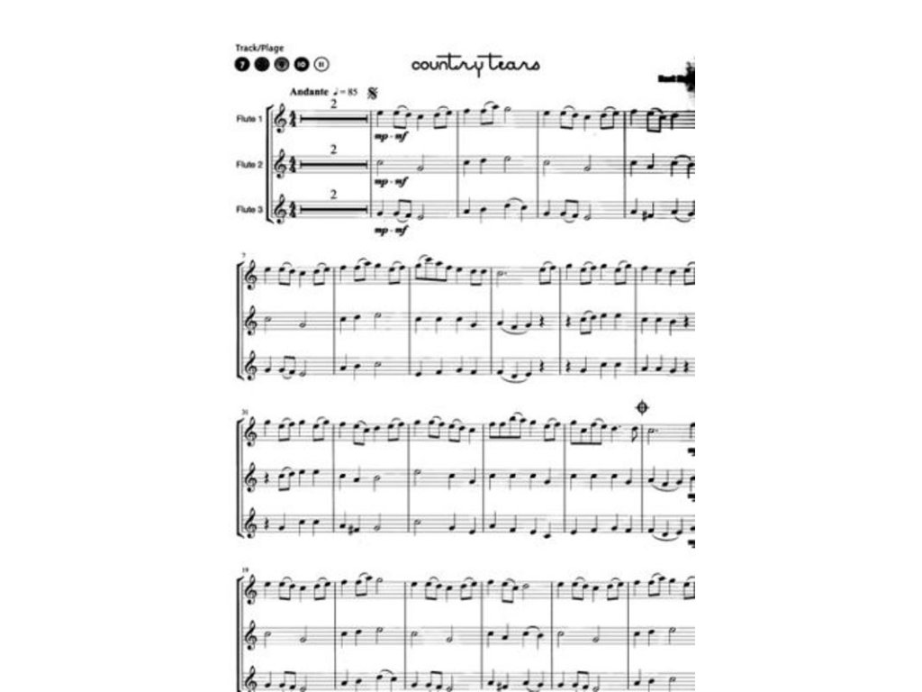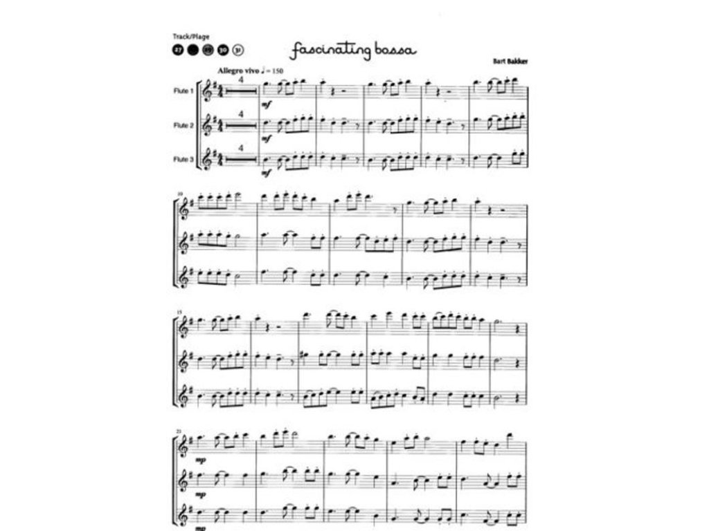Tria pro příčnou flétnu doplněna o nahrávky online, kde je každá skladba 5x (v plném znění, 3x bez jednoho hlasu pro nácvik, pouze doprovod).