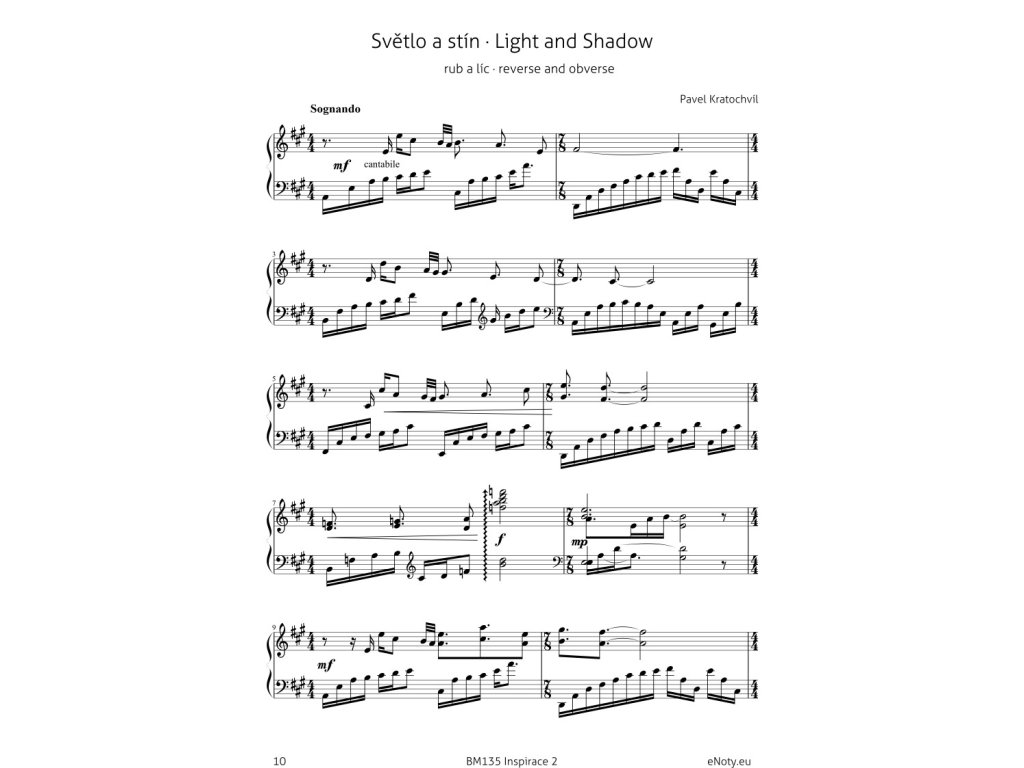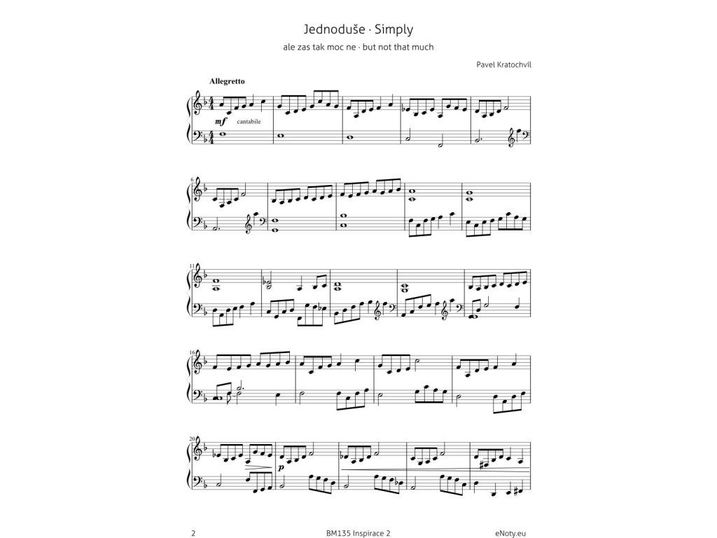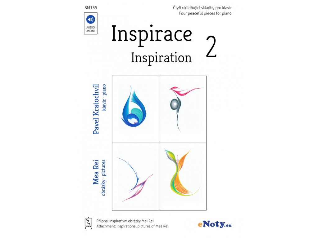 Titul Inspirace 2 je další kolekce čtyř příjemných a uklidňujících klavírních miniatur a krásných obrázků, které pro tyto miniatury byly inspirací. Obrázky nakreslila výtvarnice Mea Rei a jsou do sešitu vloženy jako samostatná příloha, abyste si mohli obrázky, stejně jako skladatel Pavel Kratochvíl, položit na klavír a vychutnat si neobvyklé spojení melodie a obrazu. A když se Vám obrázky budou opravdu líbit, můžete si je také zarámovat a pověsit na stěnu, třeba nad klavír, abyste je měli při hraní vždy na očích. :)V sešitě je uveden také odkaz ke stažení demonstračních nahrávek, které pro Vás nahrál autor skladeb Pavel Kratochvíl.