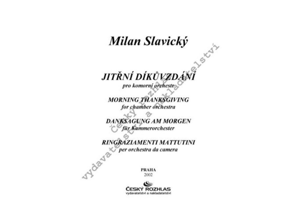 Jitřní díkůvzdání skladatele Milana Slavického báječně využívá všech specifik, která ve zvuku i schopnostech hráčů poskytuje dobrý komorní orchestr. Tektonicky jde o postupnou gradaci složenou z více gradací drobnějších s využitím střídání velmi důmyslně volených orchestrálních barev. Gradace se kupí dynamicky i pocitově až k závěrečnému tutti s hlasem zvonů.Autor sám o své inspirací říká: "Chtěl jsem vyjádřit pocity člověka, který se ráno probouzí, postupně se mu aktivují jednotlivé roviny vědomí a který se ptá: Kde to jsem? Je mi dobře? Co je s mými nejbližšími? Co mne dnes čeká? Mám k tomu sílu? Můžu tím být nějak užitečný? A postupnými odpověďmi se propracuje k pocitu: Děkuji. Děkuji Pane, že mohu být teď a tady, že mohu cítit řád světa a snažit se v něm přidat svou trošku na stranu dobra. Děkuji."