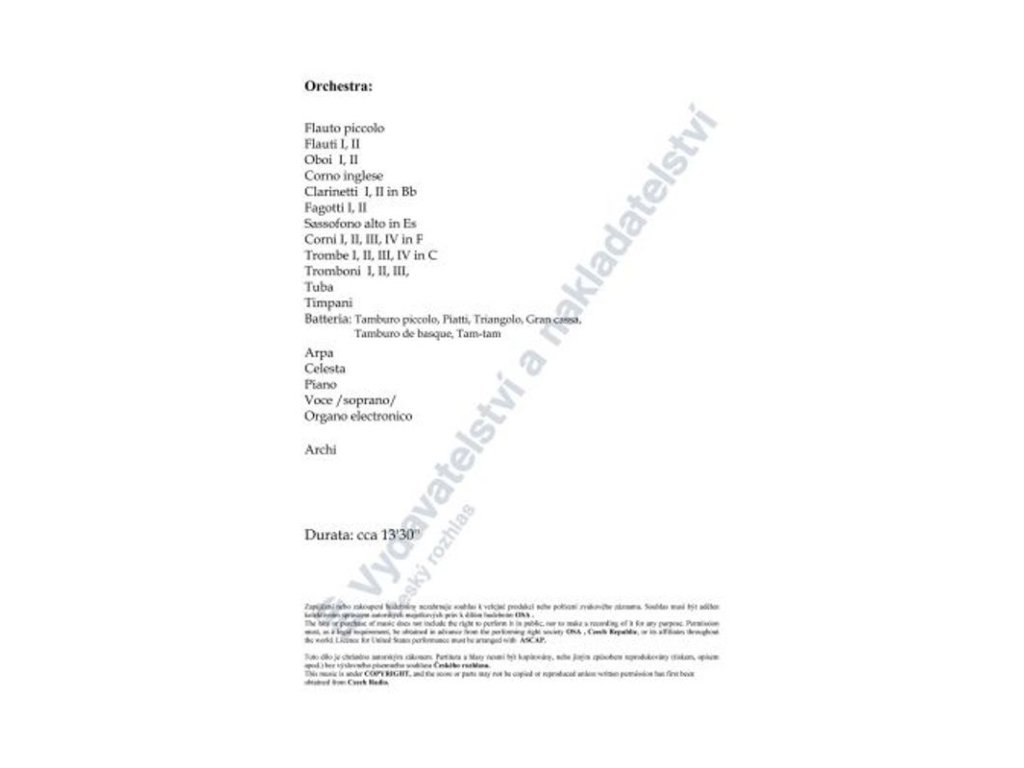 obsazení: fl picc, 2fl, 2ob, cor ingl, 2cl in B, 2fg, Asax in Es, 4cor, 4trb in C, 3tbn, tb, timp, 5batt, arp, cel, pfte, voc (soprano), el org, archi